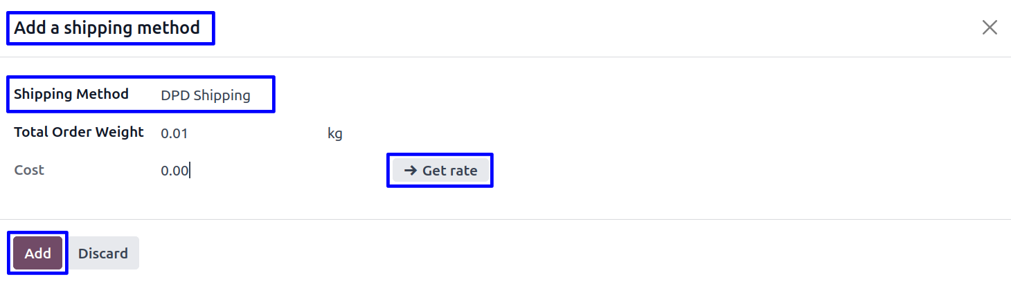 User need to select DPD shipping method and click on "Get rate" button to get the rate of shipping service and click on "Add" button.