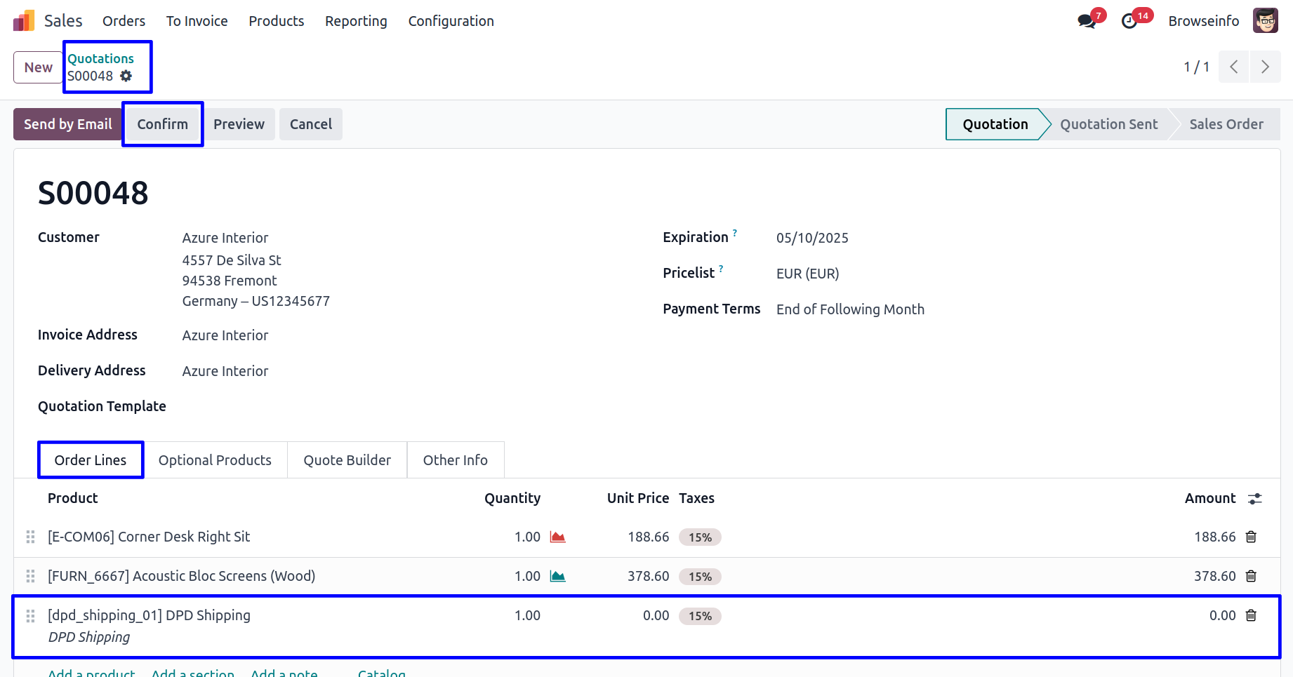 User can see the delivery rate is updated in sale order line. Now click on Confirm button to confirm the sale order.