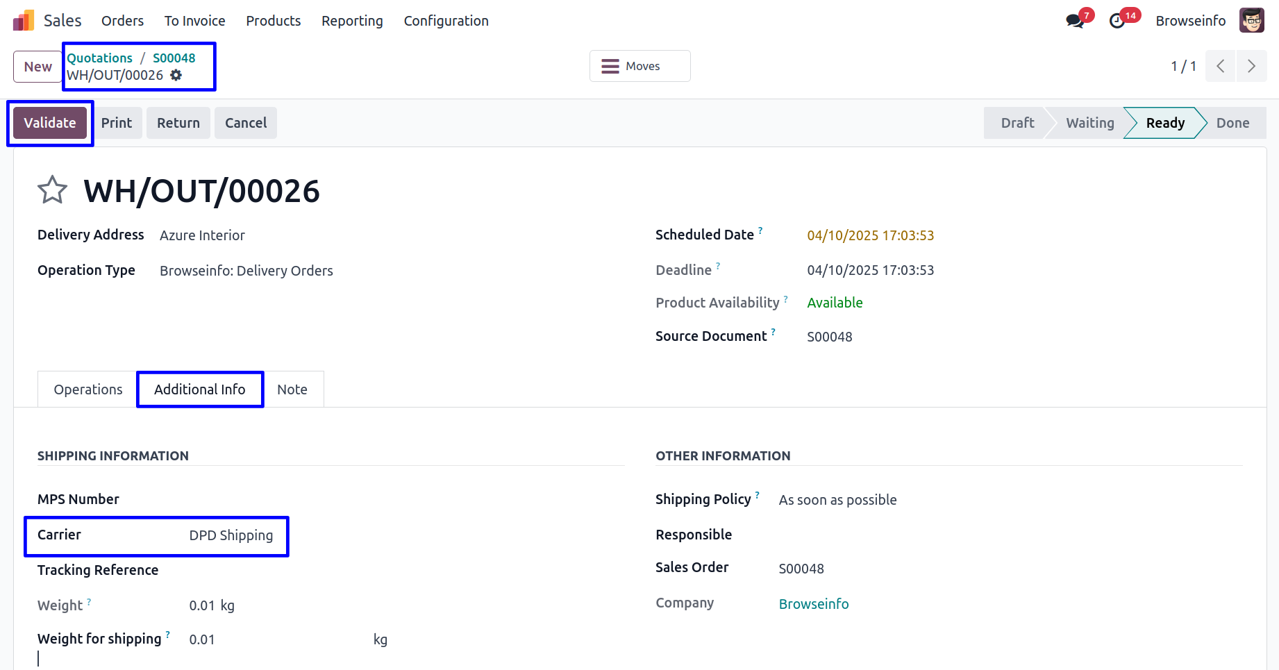 User can see the DPD Shipping Connector delivery method is updated in carrier and click on Validate button to Done delivery.