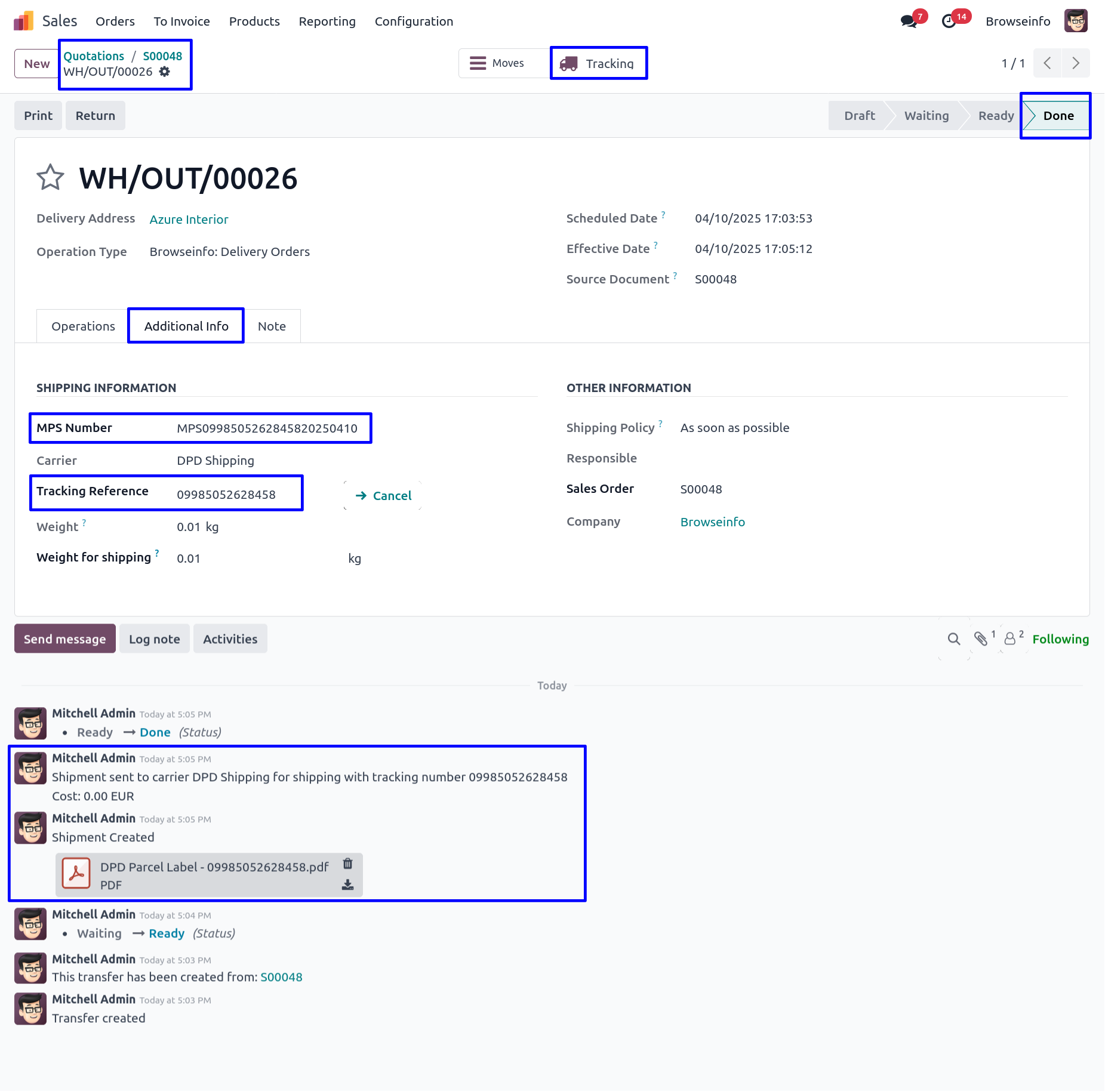 User can see the delivery is done. MSP Number, tracking reference and shipping label is generated.