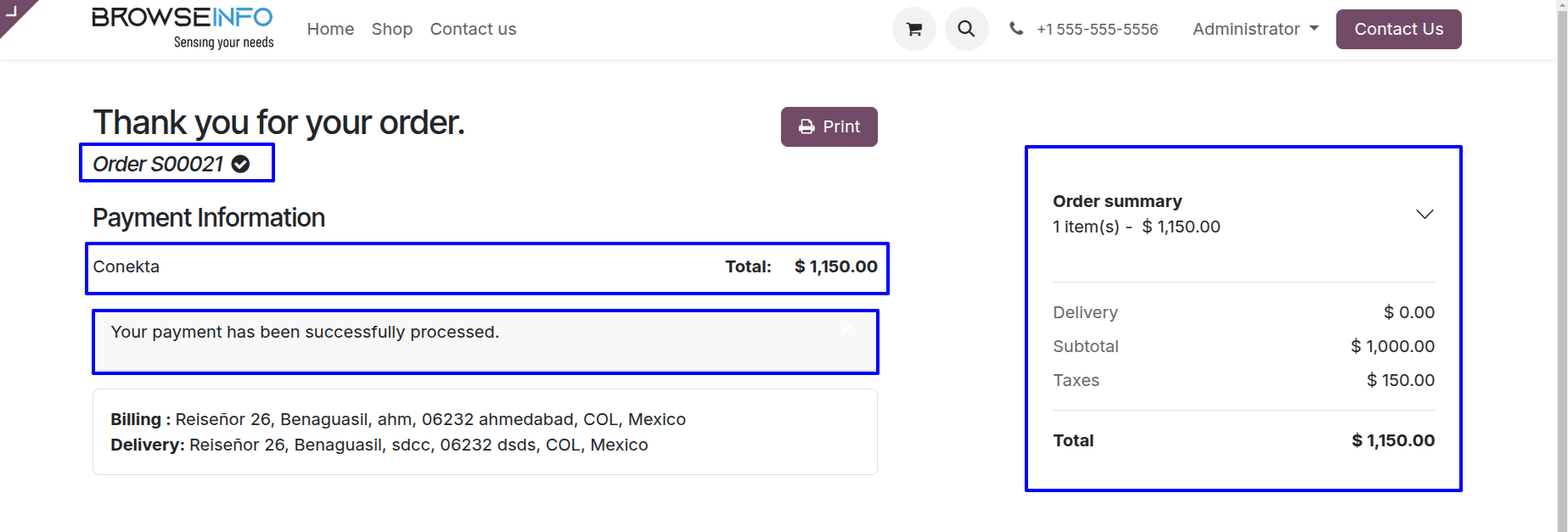 Fig. shows the sale order with Total Amount of ordered products and payment detail.