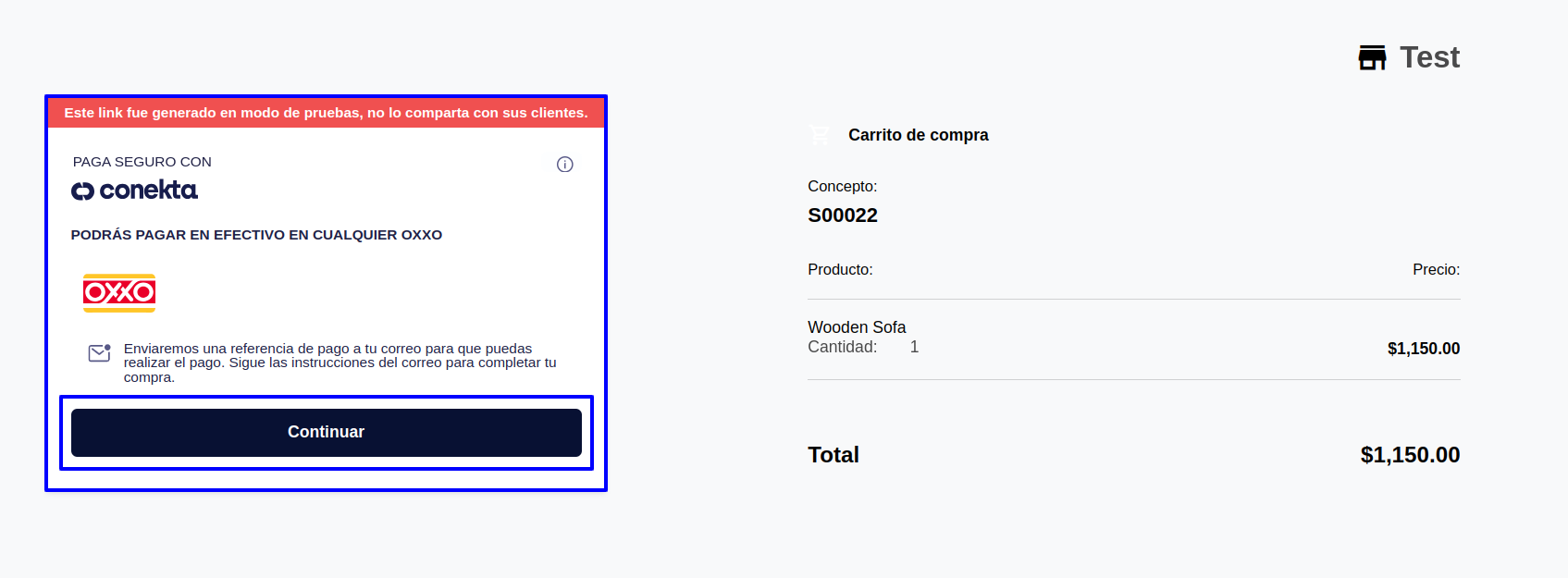 After selecting Conekta OXXO for payment, user will be redirected to payment page, on that page user need to click on the "Continue" button to go to the payment page.