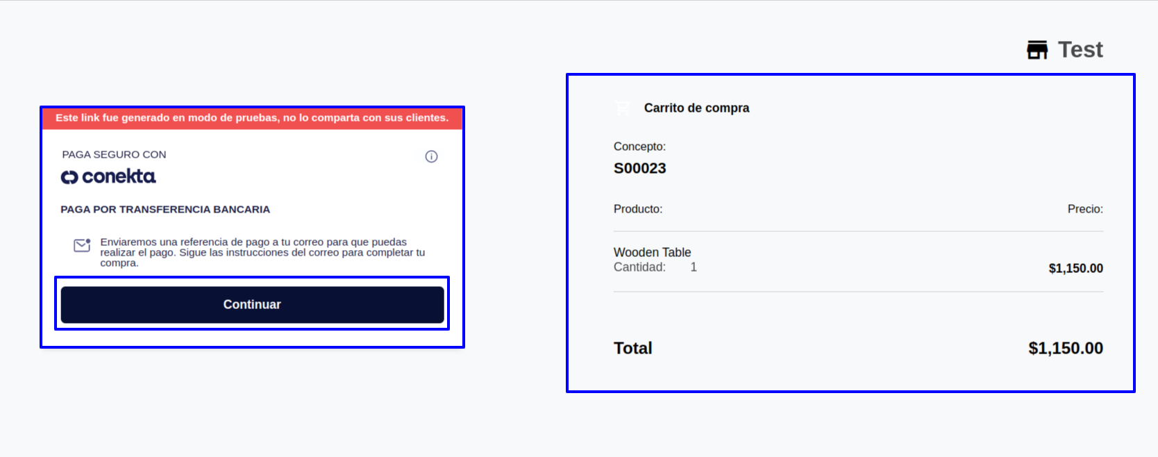 After selecting Conekta SPEI for payment, user will be redirected to payment page, on that page user need to click on the "Continue" button to go to the payment page.