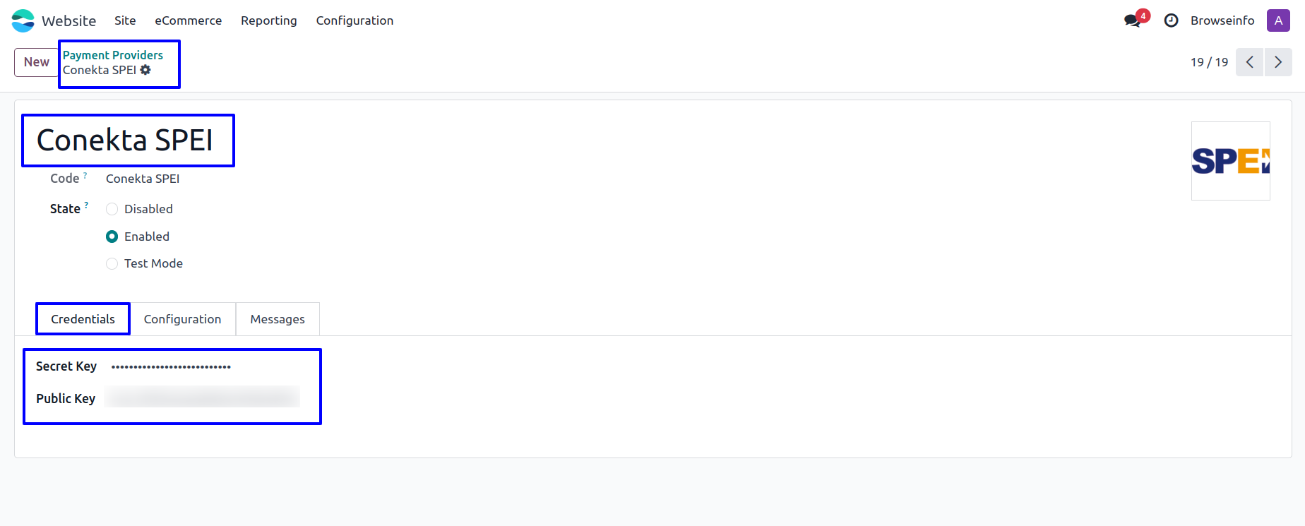 User need to enter Conekta Secret Key and public key in Conekta SPEI payment provider in Odoo.