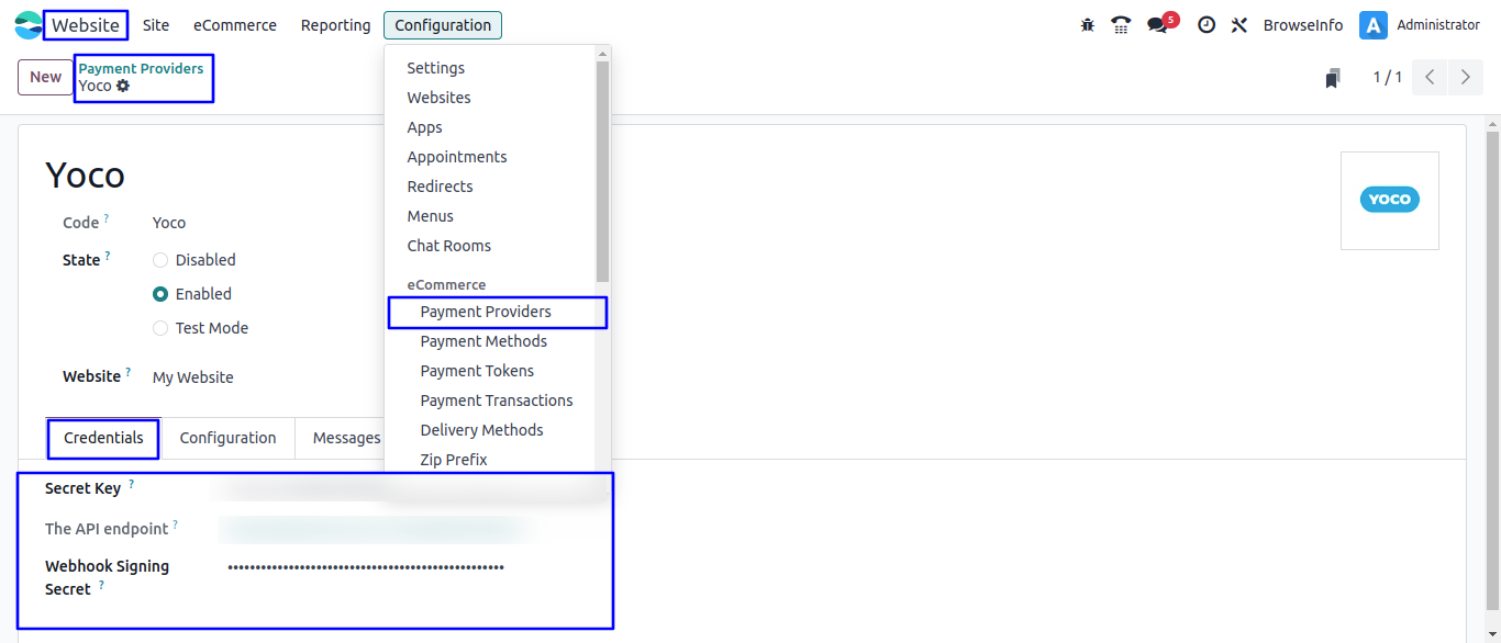 User need to enter YOCO Secret Key and Webhook Signing Secret in YOCO payment provider in Odoo.