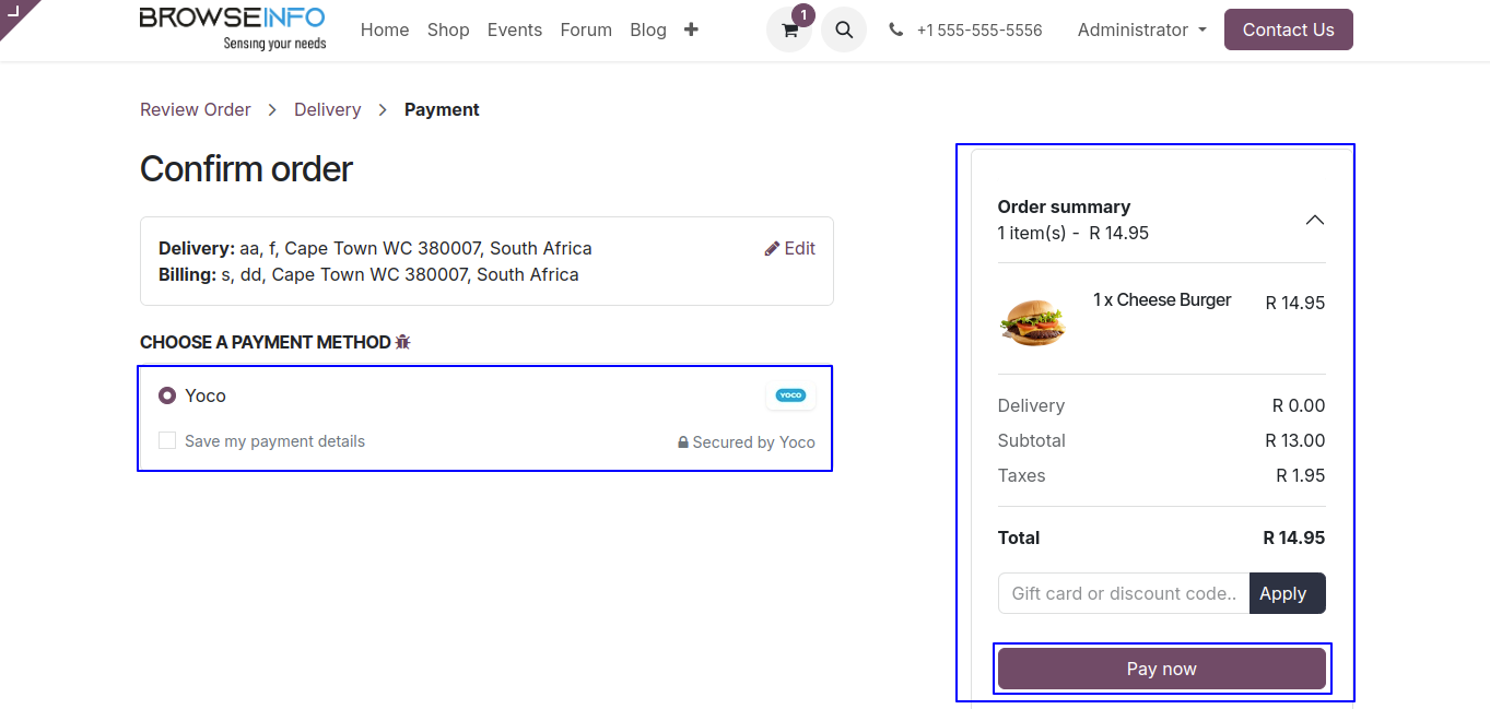 Once configured, customers will see Yoco as a payment option when confirming their order on your Odoo website.