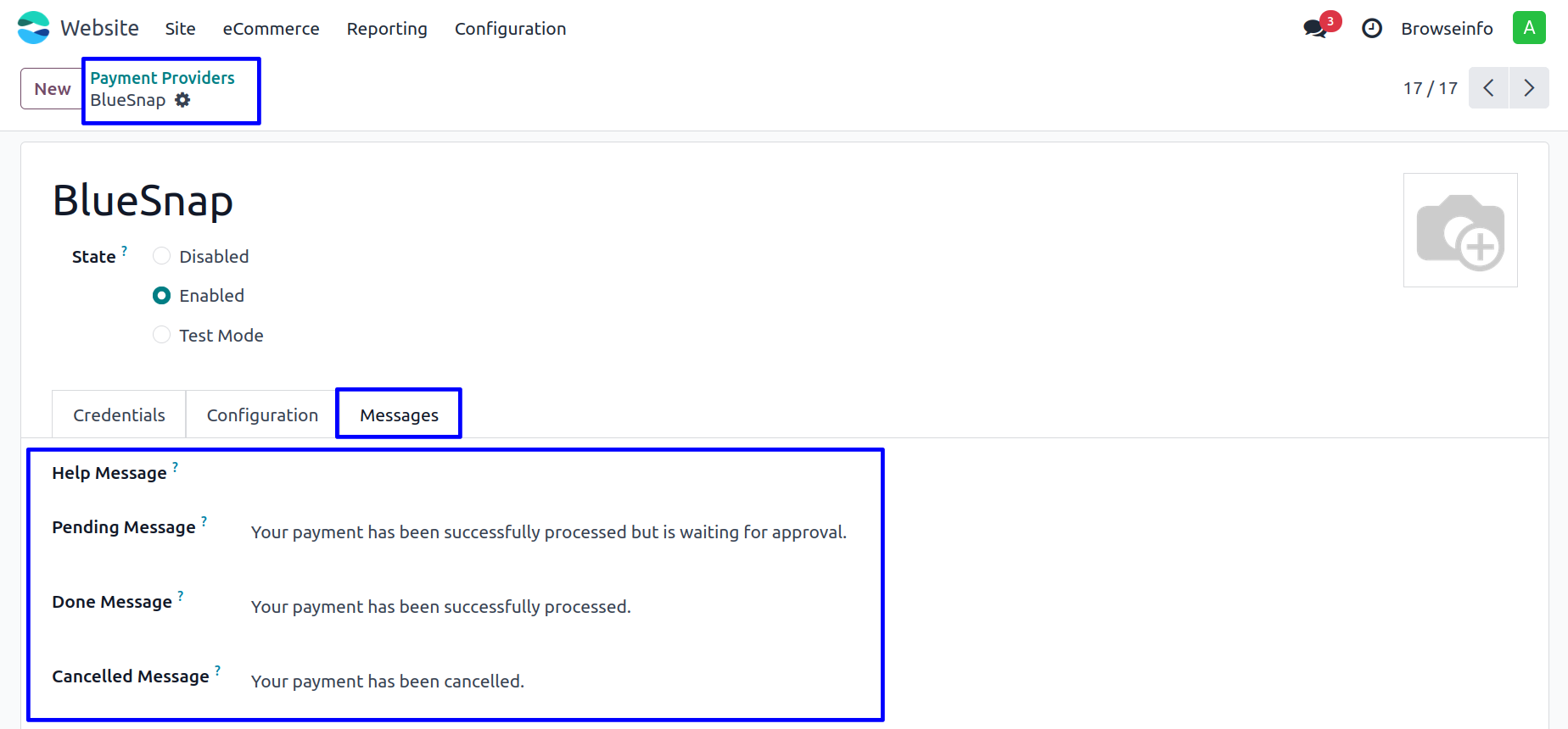 User need to enter Bluesnap Merchant id, Api Key and Bluesnap Password in Bluesnap payment provider in Odoo.