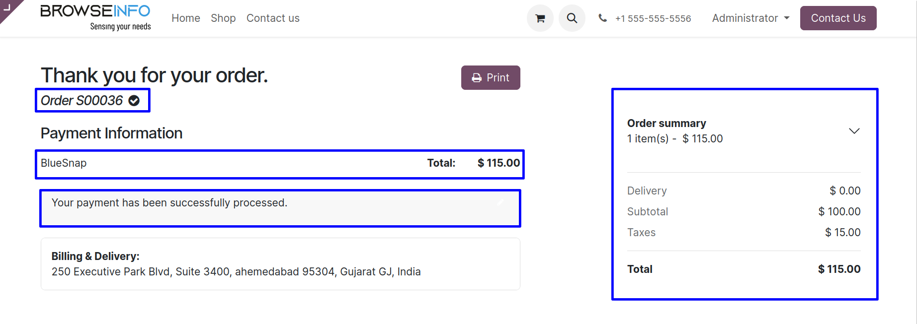 User can see Bluesnap payment has been successfully processed and payment transaction done.