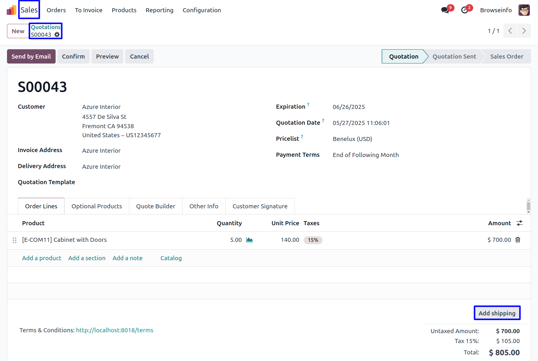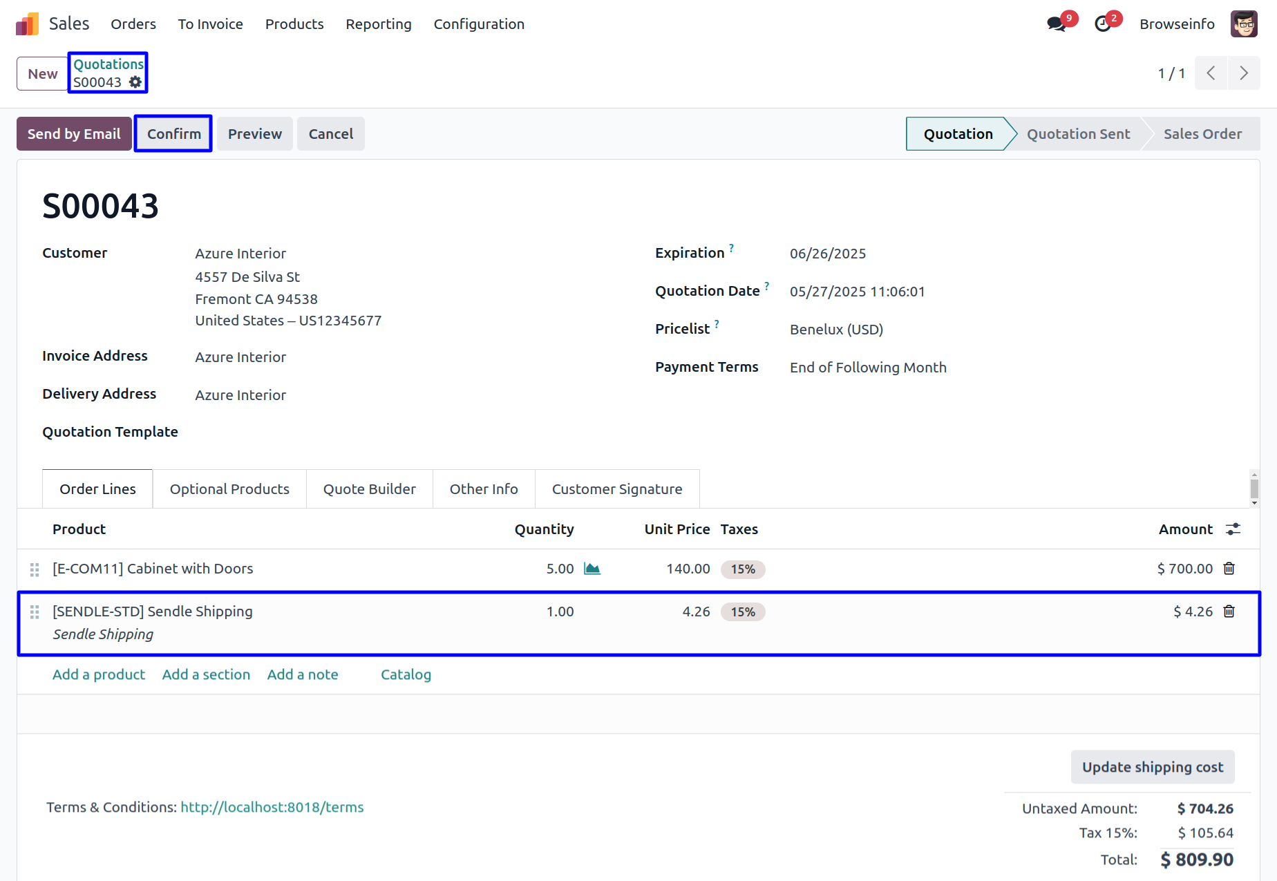 User can see the delivery method is added in sale order line. Now click on Confirm button to confirm the sale order.