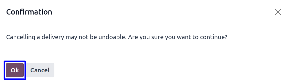 After clicking on "Cancel" button a confirmation wizard will open where user need to click on "Ok" button to cancel delivery.