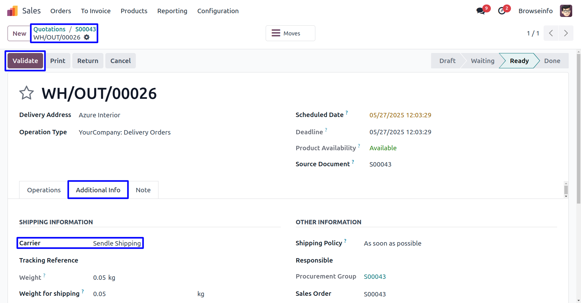 User can see the Sendle delivery method is updated in carrier and click on Validate button to Done delivery.