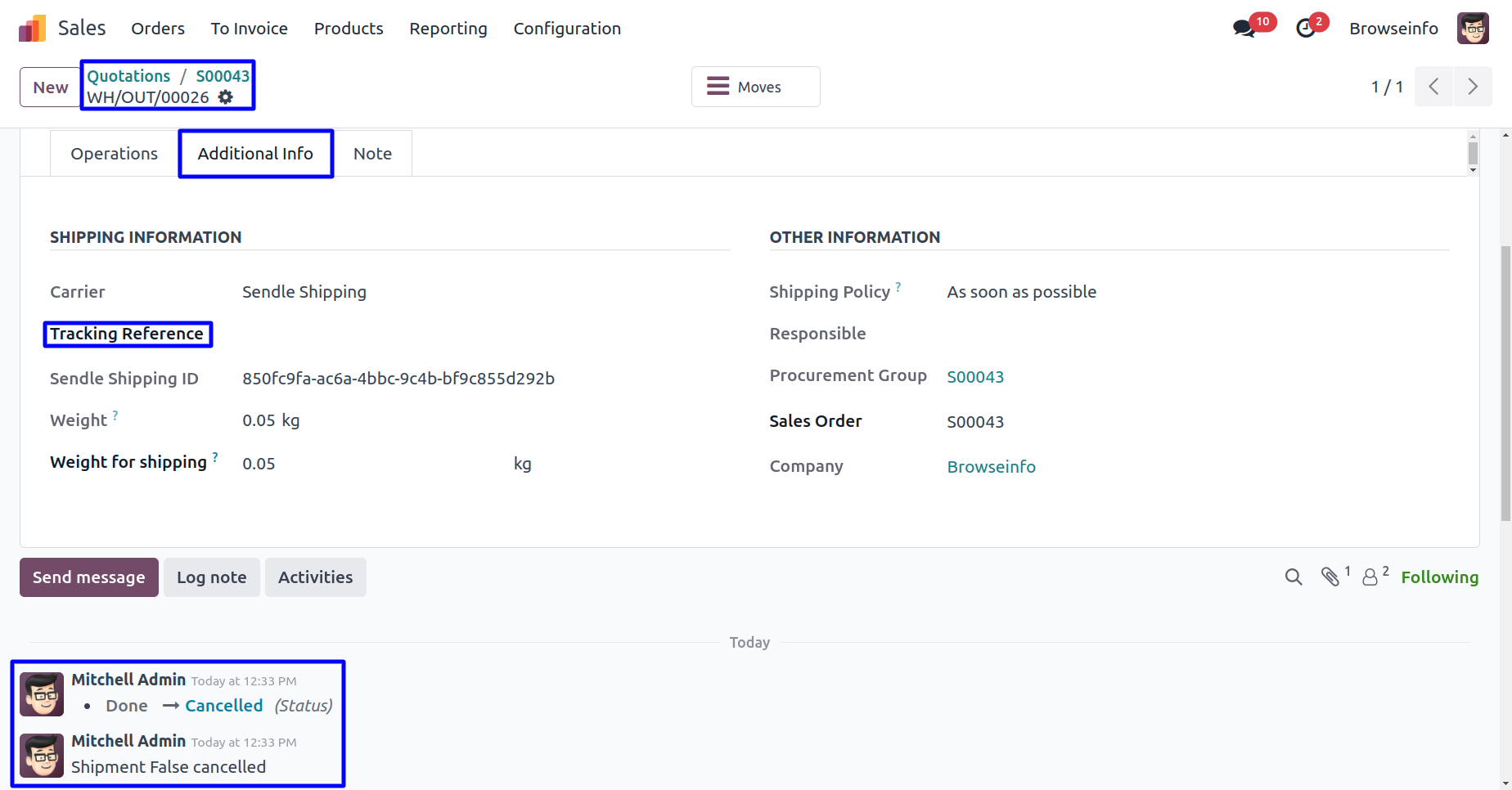 User can see the shipment is cancelled message in delivery.