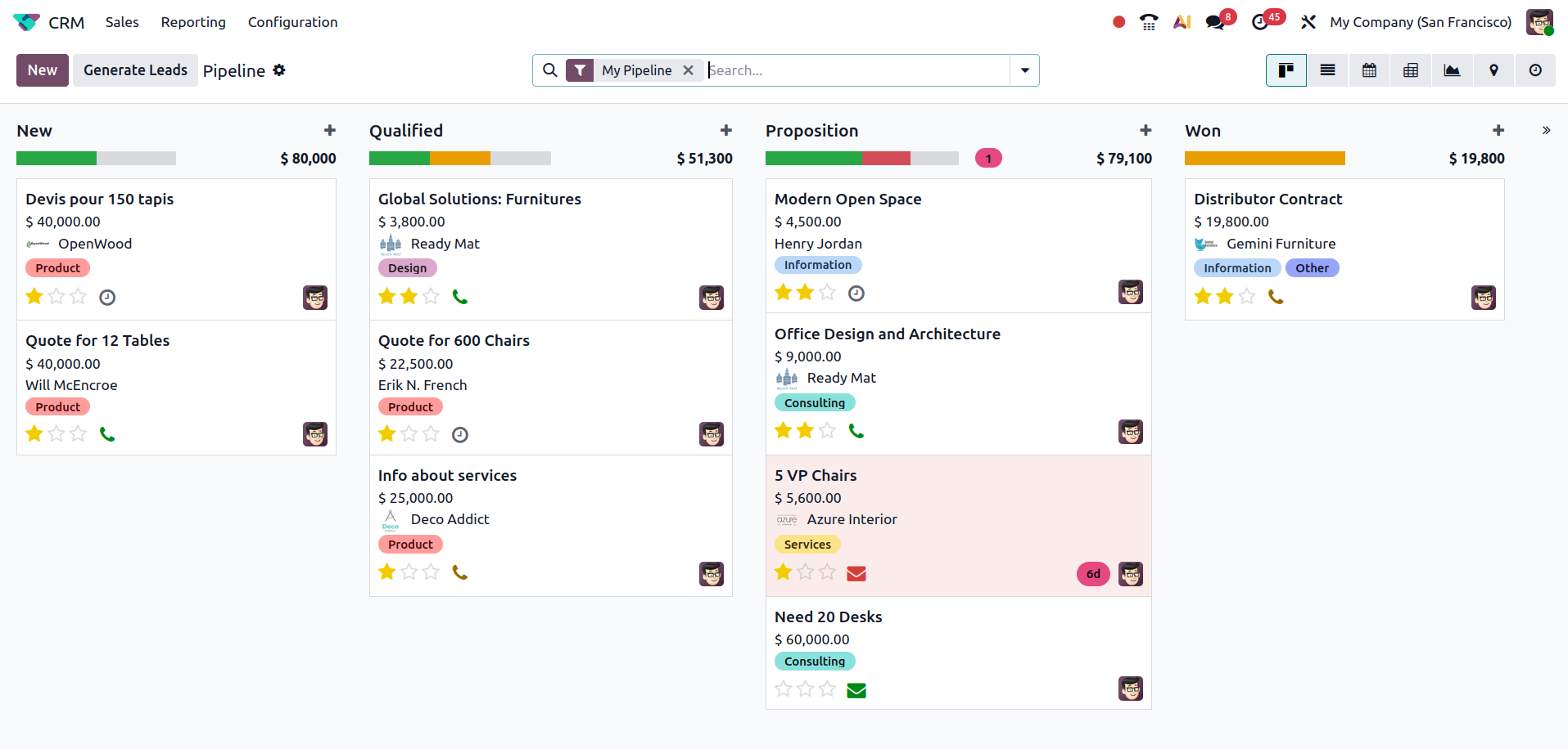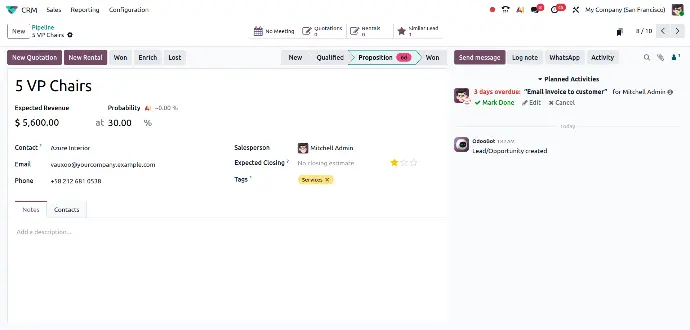 Odoo19 makes overdue activities highly visible in the CRM pipeline with a red symbol reminder. This ensures sales reps cannot overlook critical follow-ups.