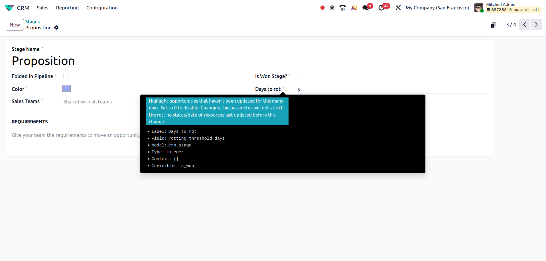 A major addition in Odoo19 CRM is the “Days to Rot” configuration per stage, allowing managers to set how many days an opportunity can stay idle before being flagged.