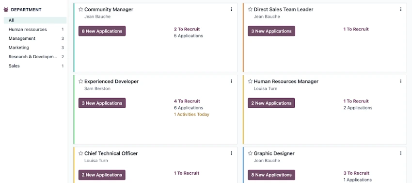 All job positions, all in one place. Keep an eye on all job postings, applicants, and scheduled activities. Every stat for every job is clearly displayed on the Recruitment dashboard.