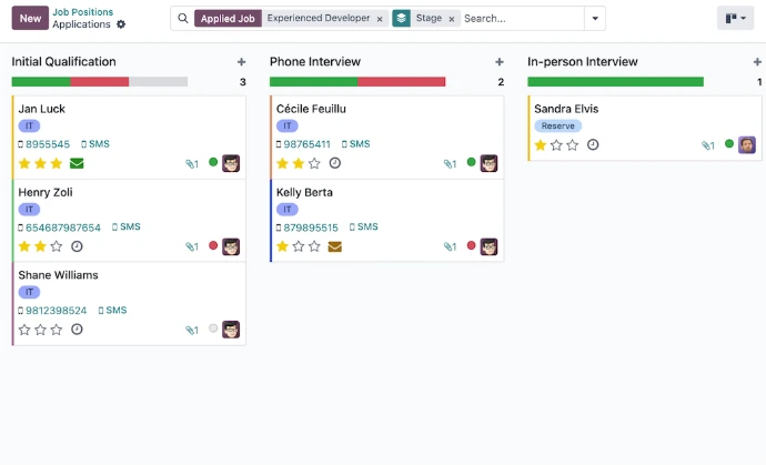 Keep applicants organized. Click on a job position to see all the applicants, organized by phase. Click and drag an applicant card to quickly change where they are in the pipeline, or have applicants automatically move in the pipeline after certain activities are done.